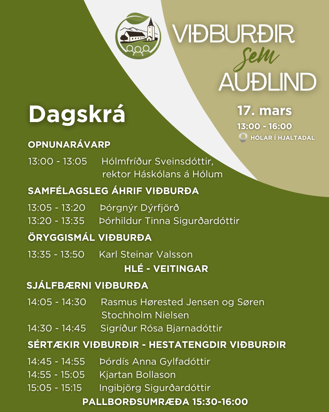 Á málþinginu verður meðal annars rætt um öryggismál viðburða og mikilvægi þeirra fyrir samfélög og efnahagslíf. Auk þess verður fjallað um sjálfbærni í tengslum í viðburðahald og sértækan viðburð, Landsmót hestamanna, sem fer fram á Hólum næsta sumar.