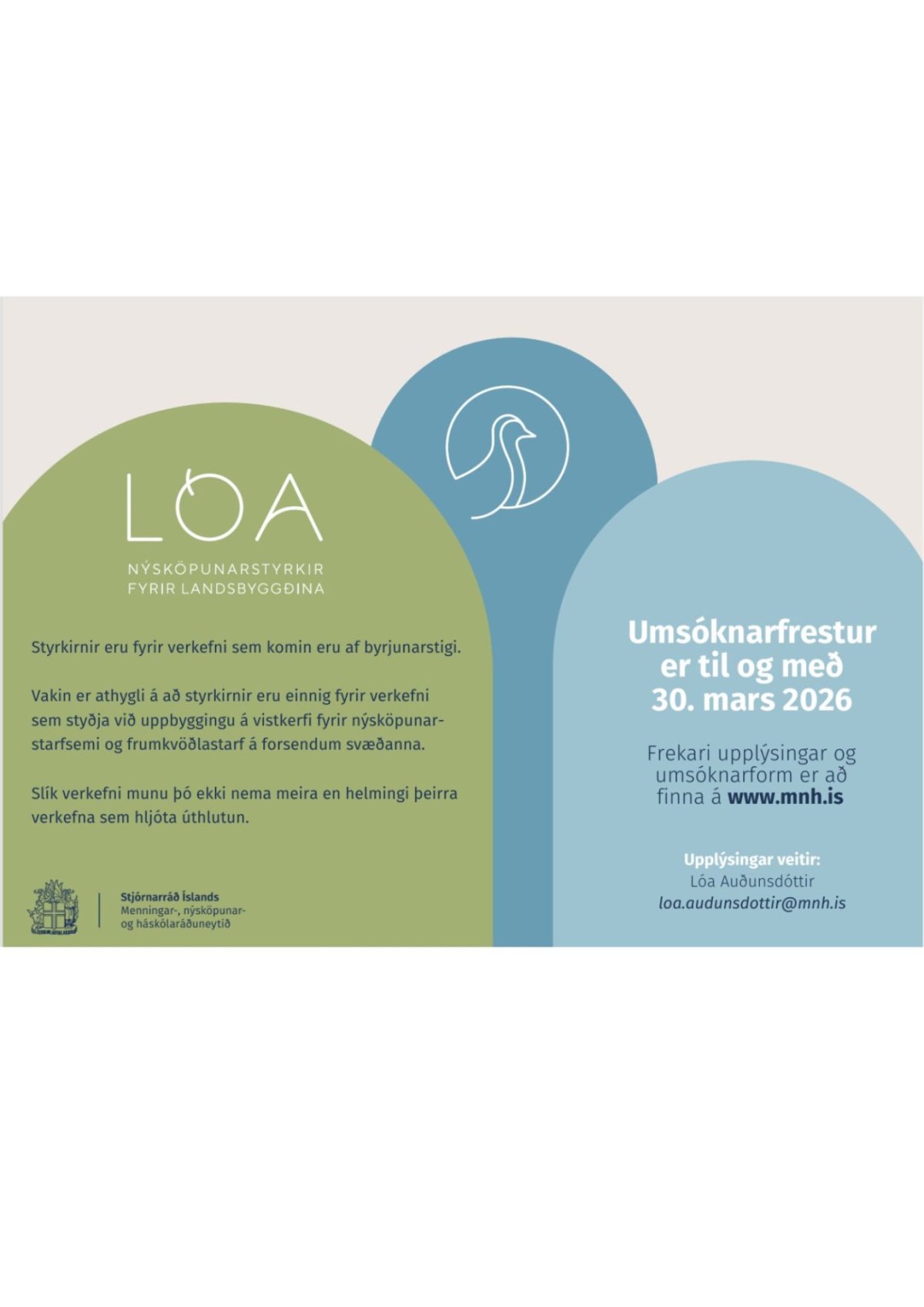 Umsóknarfrestur um Lóu, nýsköpunarstyrki fyrir landsbyggðina, er til og með 30. mars 2026.